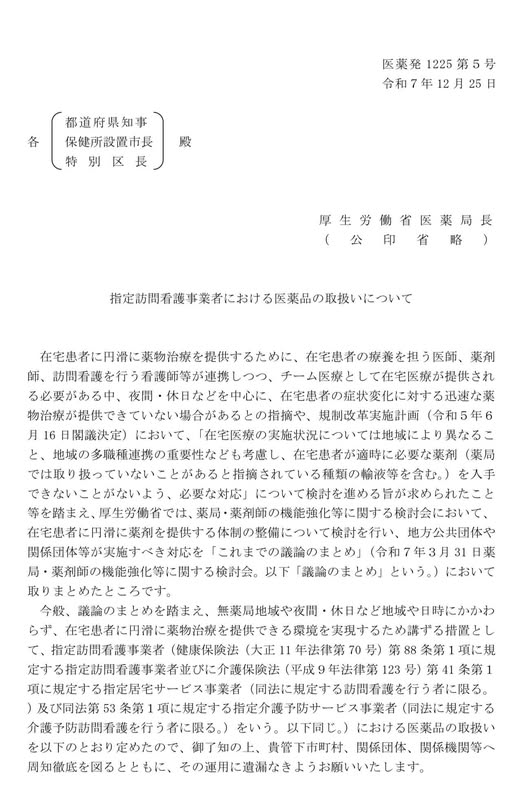 今回の改正で、訪問看護ステーションが卸から医薬品(輸液)を購入・在庫できるようになります。これで看護師さんも、そして何より患者さんの負担が少し楽になります。